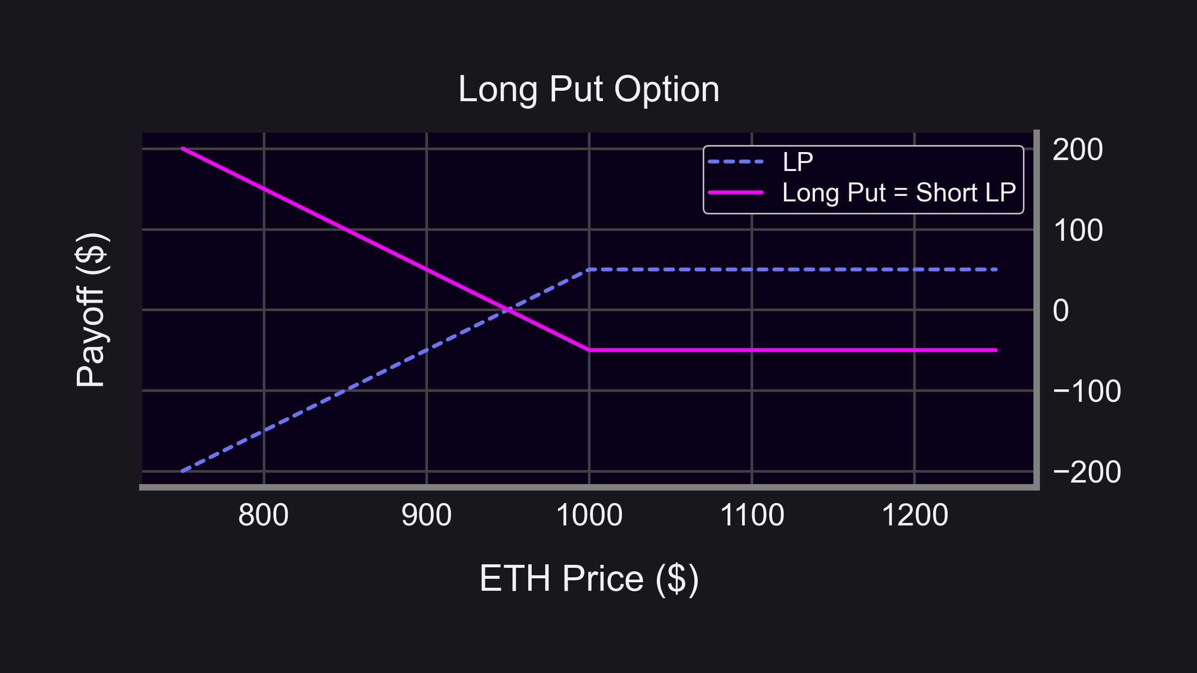 To illustrate, consider the payoff graph of an LP position compared to a put option (left side of the image below). Don’t they look strikingly similar?