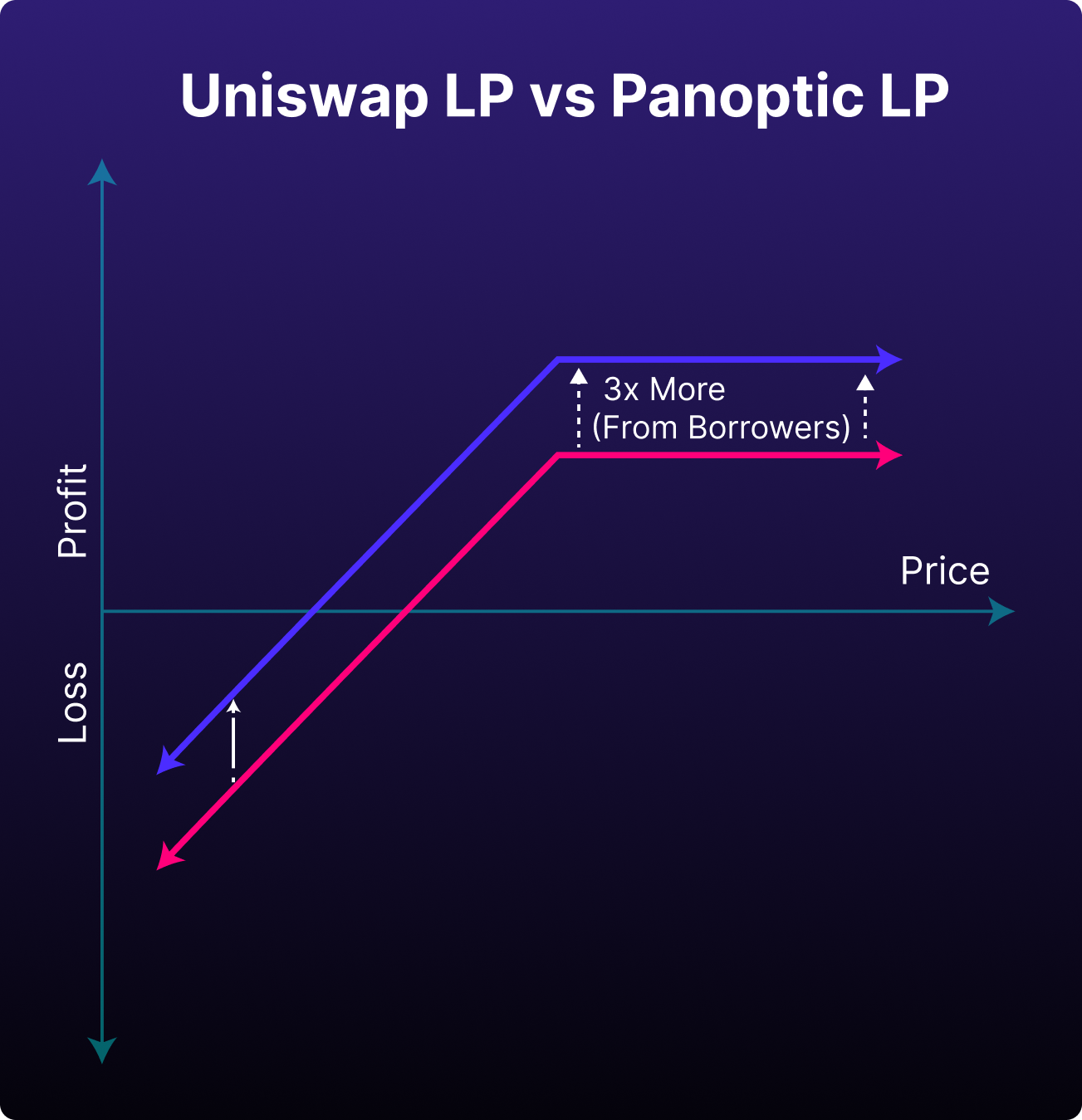 Panoptic transforms LPing into a more profitable venture. By complementing rather than competing with Uniswap, Panoptic enables LPs to replicate their Uniswap strategy while earning up to 3x more in fees. Through Panoptic, LPs not only provide liquidity to Uniswap but also leverage their LP tokens to generate additional income.