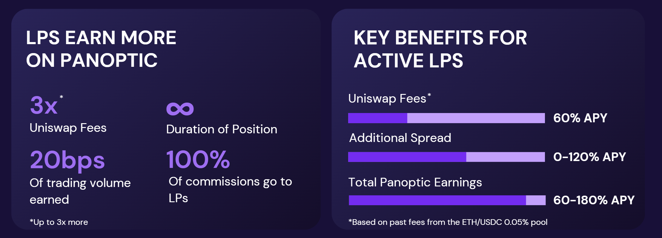 For instance, Uniswap LPs in the ETH/USDC pool earning 60% APY in fees could earn up to 180% APY through Panoptic. This 3x increase is driven by the Panoptic’s spread.