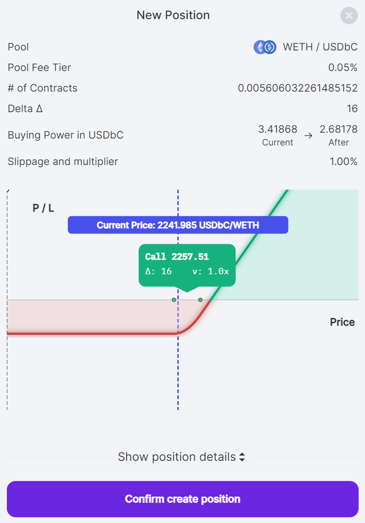 By subtracting the buying power by the position requirement, traders will know how much buying power they will have after the trade. Panoptic displays this in the position review screen that shows how much buying power will be available after the position is opened.