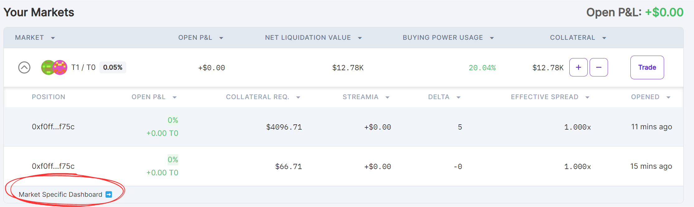 You can view more details about your positions in a specific market by clicking market specific dashboard in the table dropdown.