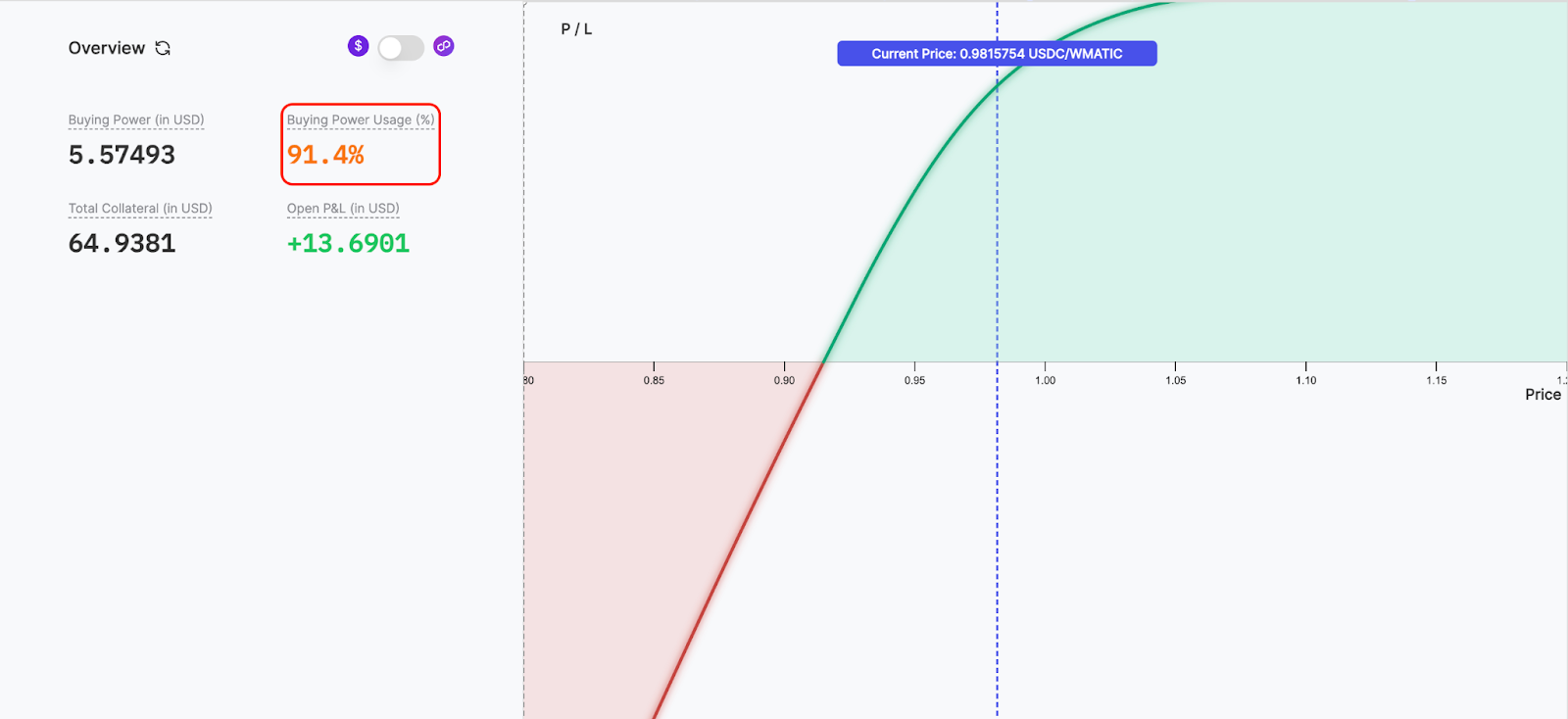 A trader becomes liquidatable if their buying power usage exceeds 100%. Panoptic’s market dashboard allows you to quickly monitor your total buying power usage for all your markets.