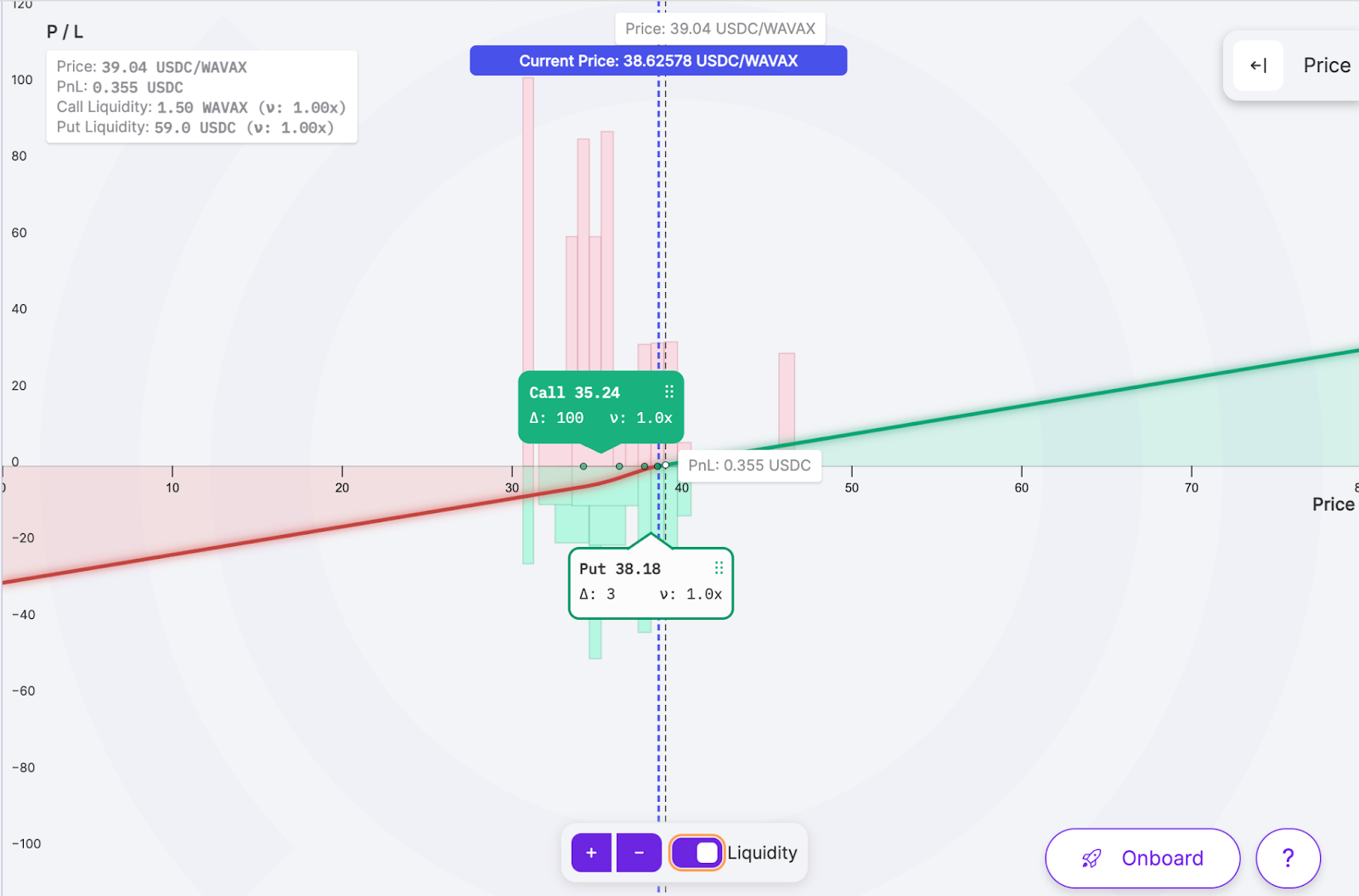 • Bar depth: Represents the amount of liquidity of the option. The taller the bar, the more liquidity available for option buyers.