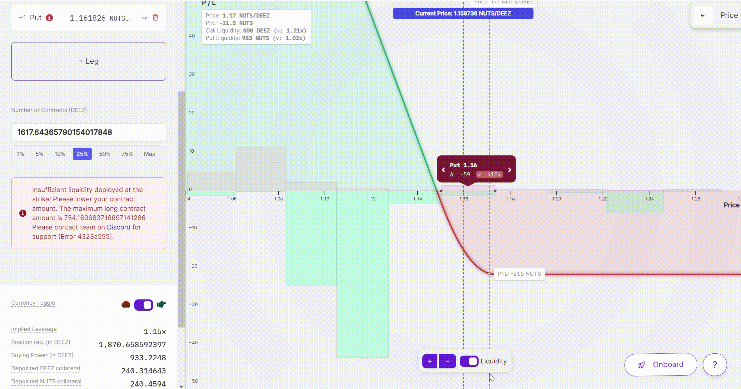 By default, the liquidity distribution displays all options but can be filtered to specific timescales. When dragging an option leg to adjust its strike price, the liquidity distribution will filter to only show liquidity available for that contract’s timescale