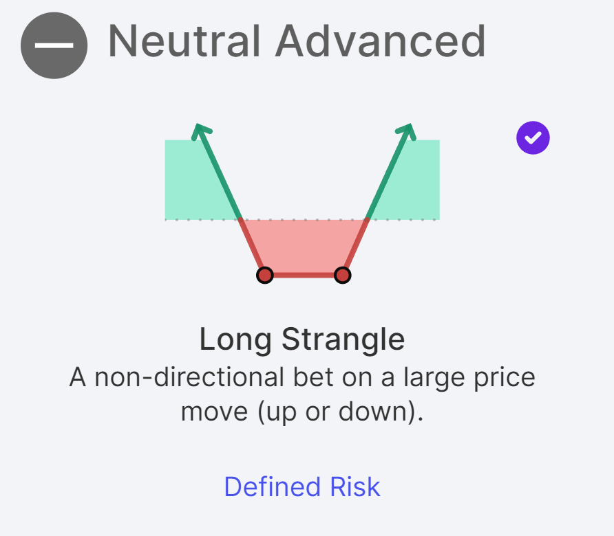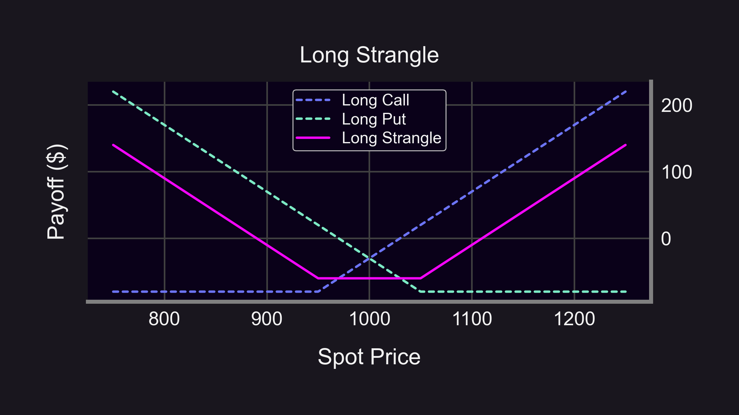 Option legs are the building blocks of options strategies. A single leg might be a straightforward call or put option. However, combining these into multiple-leg strategies, such as a long strangle, enables traders to profit from significant price movements in any direction. This can be visually represented as in the picture below, where the pink line indicates profits and dotted lines show individual legs.