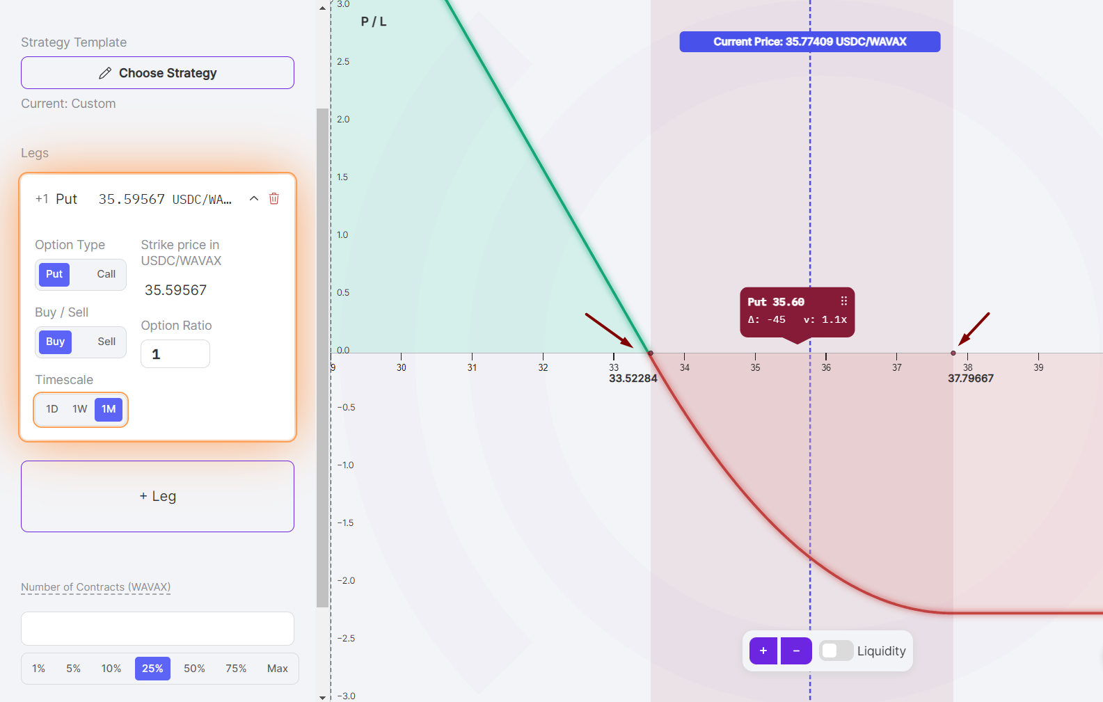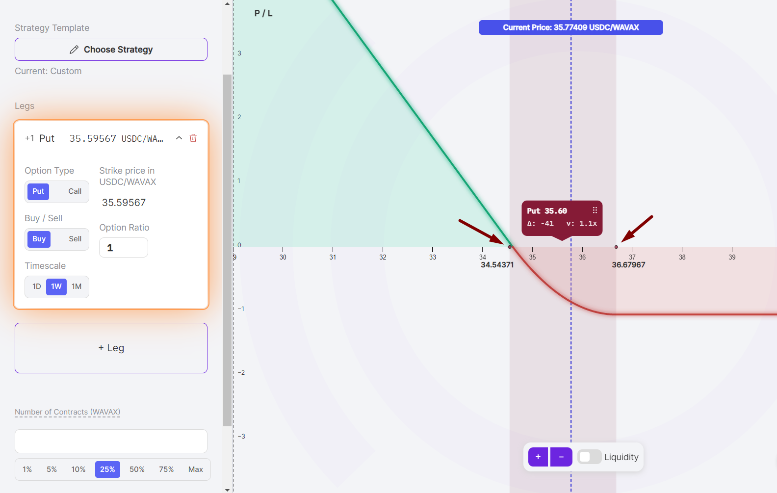 The example above shows a one-week timescale. The price range of the AVAX put is between $34.54 and $36.68. This option has a width of $2.14 (2.14 = 36.68 - 34.54). This means that the option will accumulate streamia as long as the AVAX price is between $34.54 and $36.68.