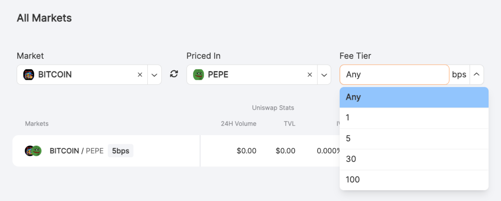 Pick Your Fee Tier: Select a fee tier corresponding to the Uniswap pool’s fee tier. Consider the Uniswap pool’s stability, liquidity, and volume to guide your decision. Use the table below as a general guideline: