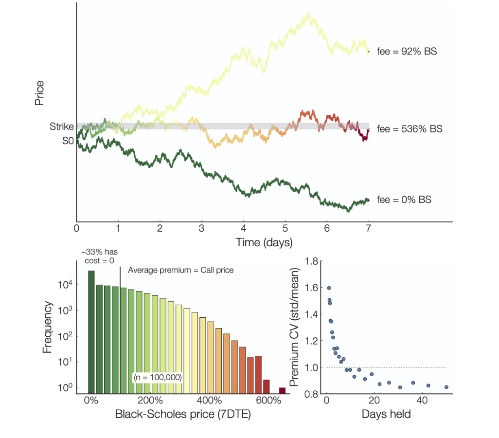 • Bottom left chart: shows that, on average, the premium in Panoptic matches the Black-Scholes price, with a significant portion of simulations resulting in zero premium.