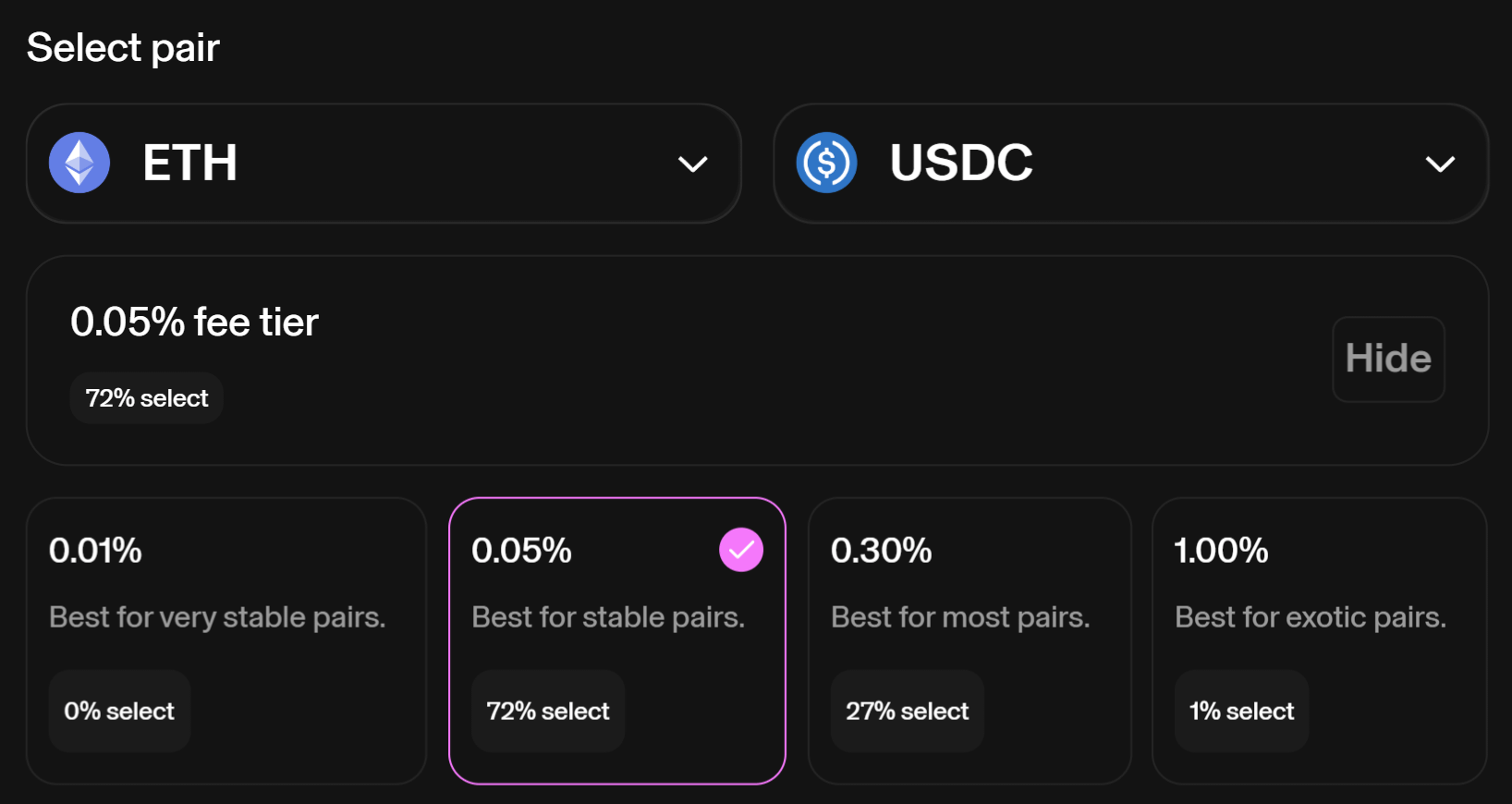 In Uniswap v3, this refers to the percentage fee that traders pay when they execute a trade on the platform. This fee is distributed to the liquidity providers who have supplied liquidity to the pool in the price range where the trade occurs. Uniswap v3 offers different fee tiers to accommodate various types of trading pairs. Common fee tiers are 0.05%, 0.01%, 0.3%, and 1%. Lower fee tiers are typically used for stablecoin pairs or highly correlated assets, while higher fee tiers are used for more volatile pairs.