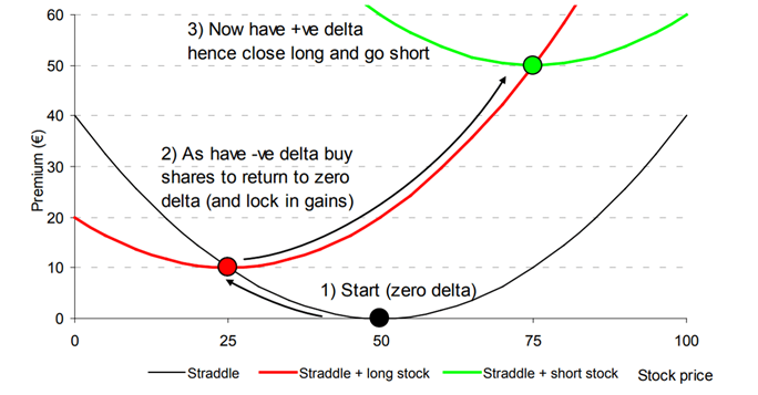 The above figure illustrates the natural delta-hedging progression within a hypothetical gamma scalping paradigm example. In step one, the initial delta of an ATM straddle is zero. In step two, delta gradually turns negative, the underlying is purchased, and the opposite process occurs in step three with a shift to positive delta as the underlying is then shorted.