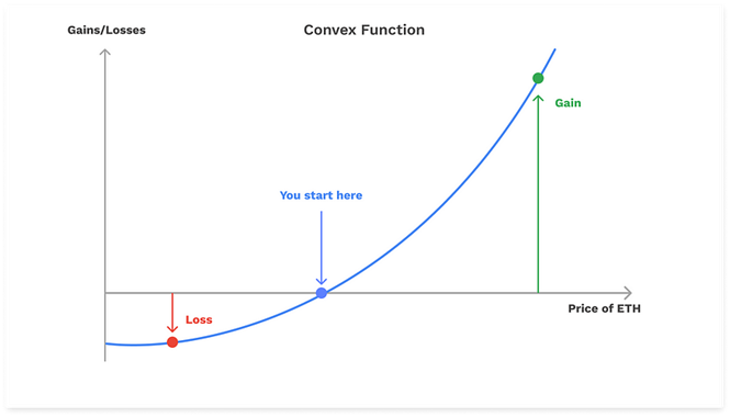 The graphic below reflects how an option will always be as valuable, if not more valuable, than a linear product (such as buy-and-hold or long perps) because of gamma. While the full breadth of financial products (linear or nonlinear) will contain some form of delta, the gamma of linear products will always be zero due to the lack of convexity.