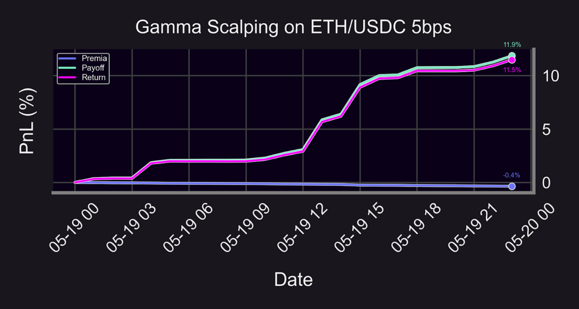 The overall return for the strategy is roughly 11.5% with the premia paid amounting to approximately -0.4%. For the sake of historical context, the selected one-day period for the backtest is a particularly volatile backdrop as there were several stablecoin depegs the following day on May 20, 2021. The backtest is an illuminating case study as to how gamma scalping, in a highly mercurial environment such as the date in question, can potentially harvest immense returns over an abbreviated time horizon.