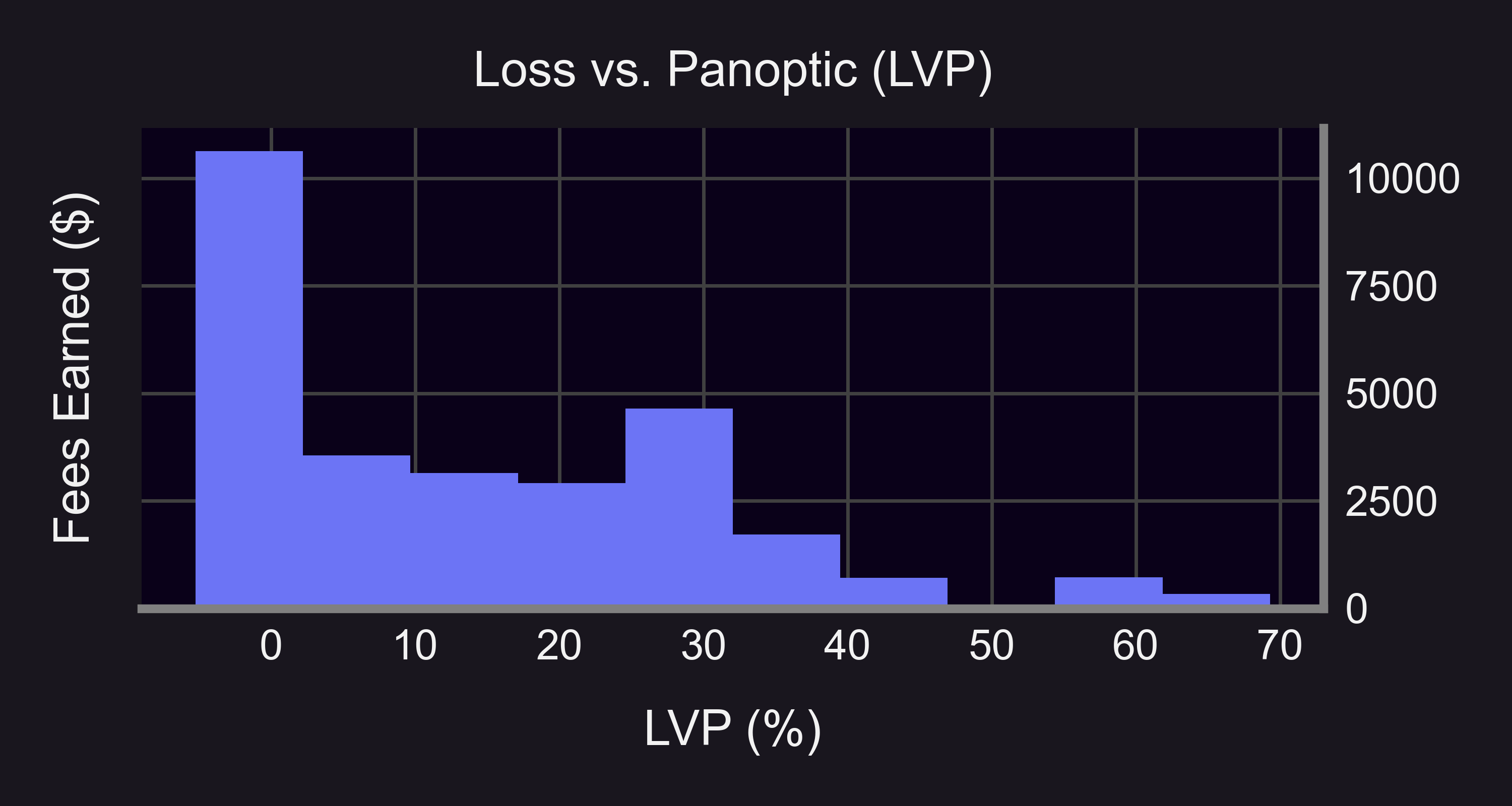 If we plot the distribution of LVP in the WETH/USDC 0.3% pool, we see that LVP ranges from 0%-69%, with a significant spike around 30% LVP. That means that a significant amount of Uniswap LPs could be earning 1.43x more fees on Panoptic.