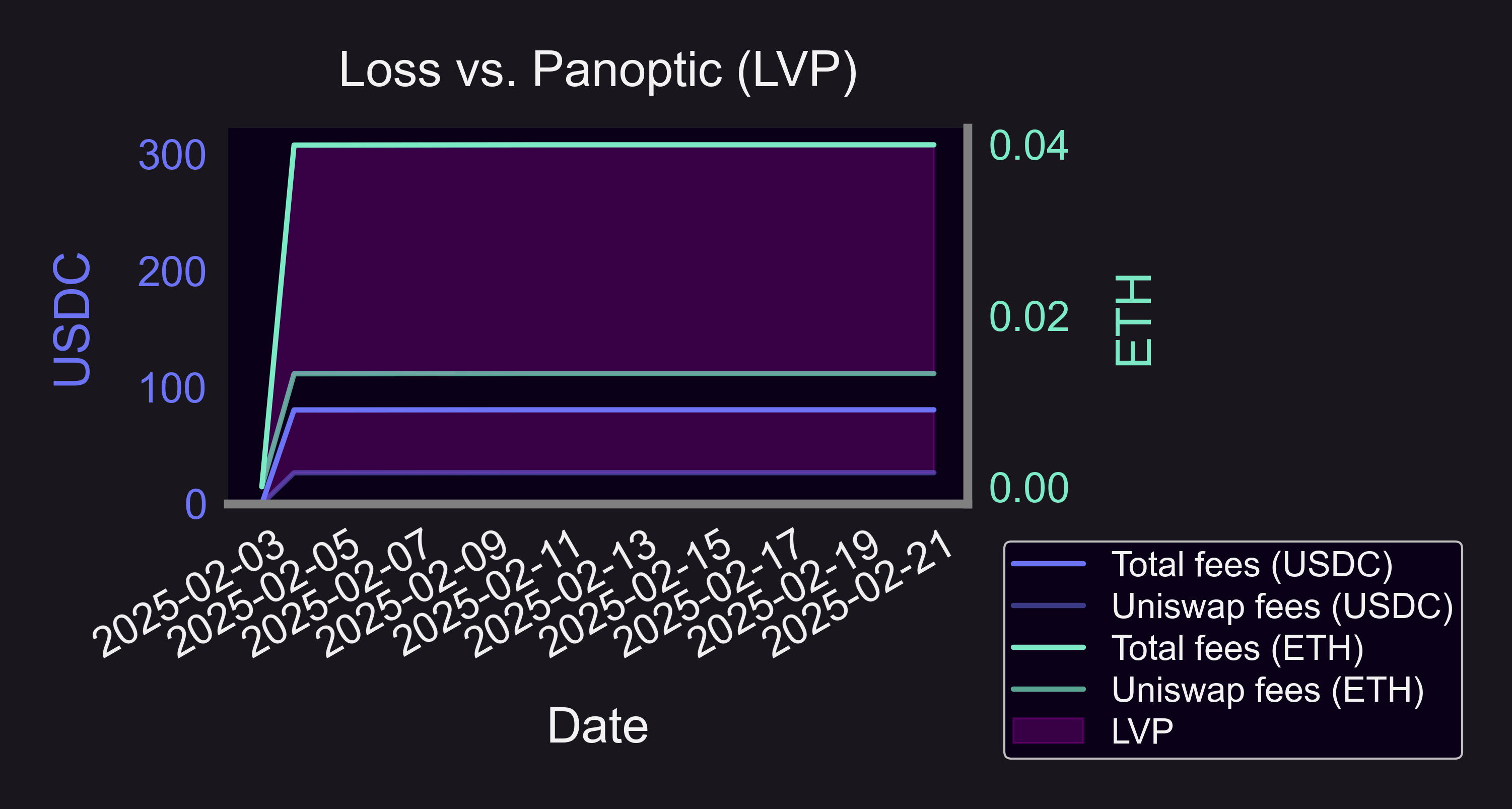 Loss Versus Panoptic (LVP) quantifies how much an LP loses out on by staying in vanilla Uniswap. If a Panoptic LP position can generate 3× more total fees, the LVP is roughly 67%—meaning the vanilla LP leaves two-thirds of potential revenue uncollected. We’ve seen typical LVP values hovering around 15–20% in the WETH–USDC pool.