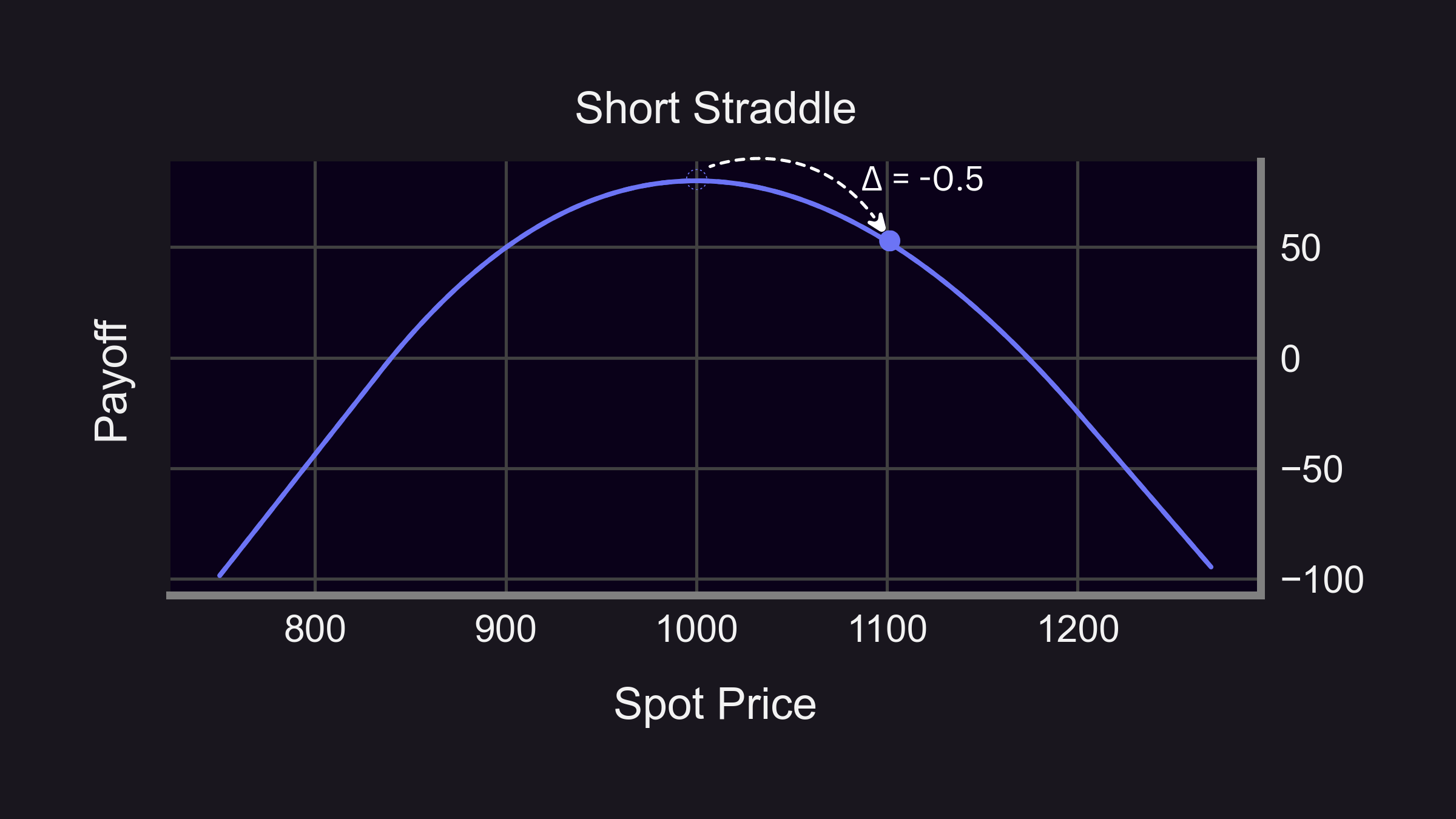 The above image displays how the profit threshold of a short straddle position is fairly narrow when incorporating underlying ETH price movement scenarios. As the initial portfolio delta shifts, there is an underlying rebalancing process needed to maintain delta-neutrality as the price of ETH either rises or falls.